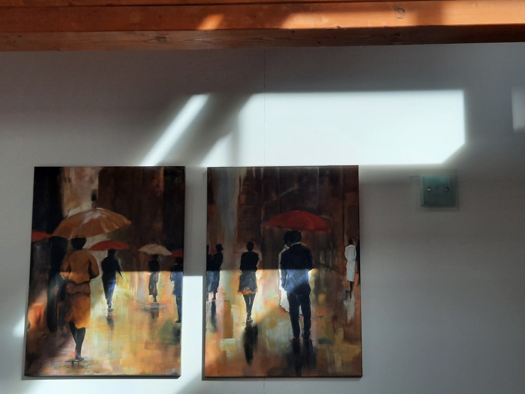 Pasan volando hojas verdes de abedul cuando un rayo de sol entre nubes, penetra a través de los cristales e incide, en la pared, justo ahí, debajo de uno de los cuadros con paraguas. Casualidad que haya dejado de llover. Antes ese punto, sin sol, permanecía anodino, callado, insignificante y ahora, rato llevo, ensimismado en él, a la espera que el tiempo defina la fugacidad de un cambio.