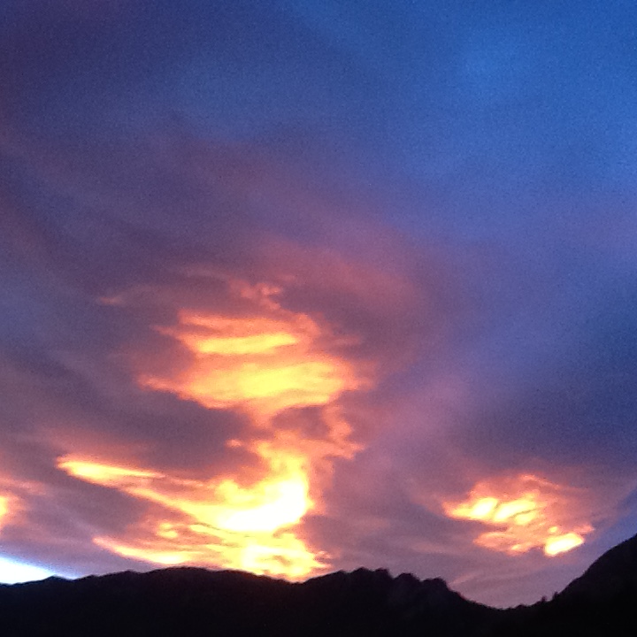 Entre los bordes de unas nubes, en su impetuoso impulso a mezclarse y oscurecerlo todo, los últimos rayos, sacados del horizonte, pintan de cárdeno el cielo.