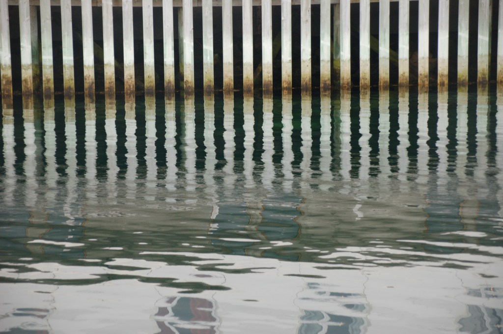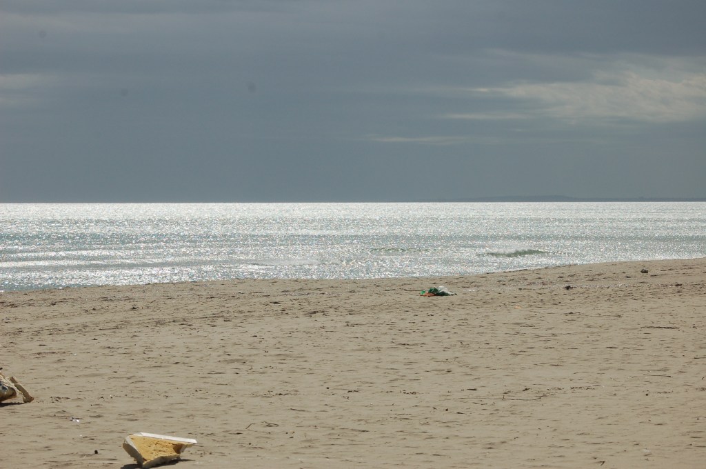 El mar en mayo ofrece un frescor de aluminio brillante sobre un fondo oscuro manchando también la arena que la bajamar descubre. La marea deja en la arena formas a modo de diminutas dunas que semejan las arrugas de la frente de Neptuno. No hay oleaje que interrumpa la quietud y los brillos metálicos se expanden evocando placidez. Tensado, el horizonte, brilla parcelando la imagen, de sombras y abismos que se mecen, en una ebriedad de vacío perforado.