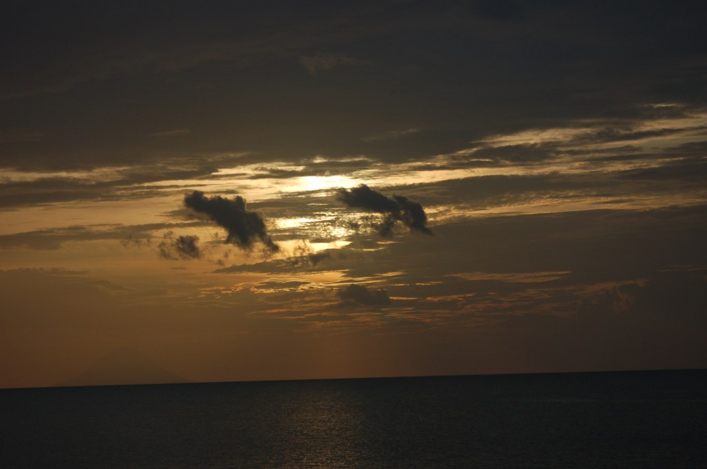En el horizonte, entre cielo y mar azul se sitúa un barco.